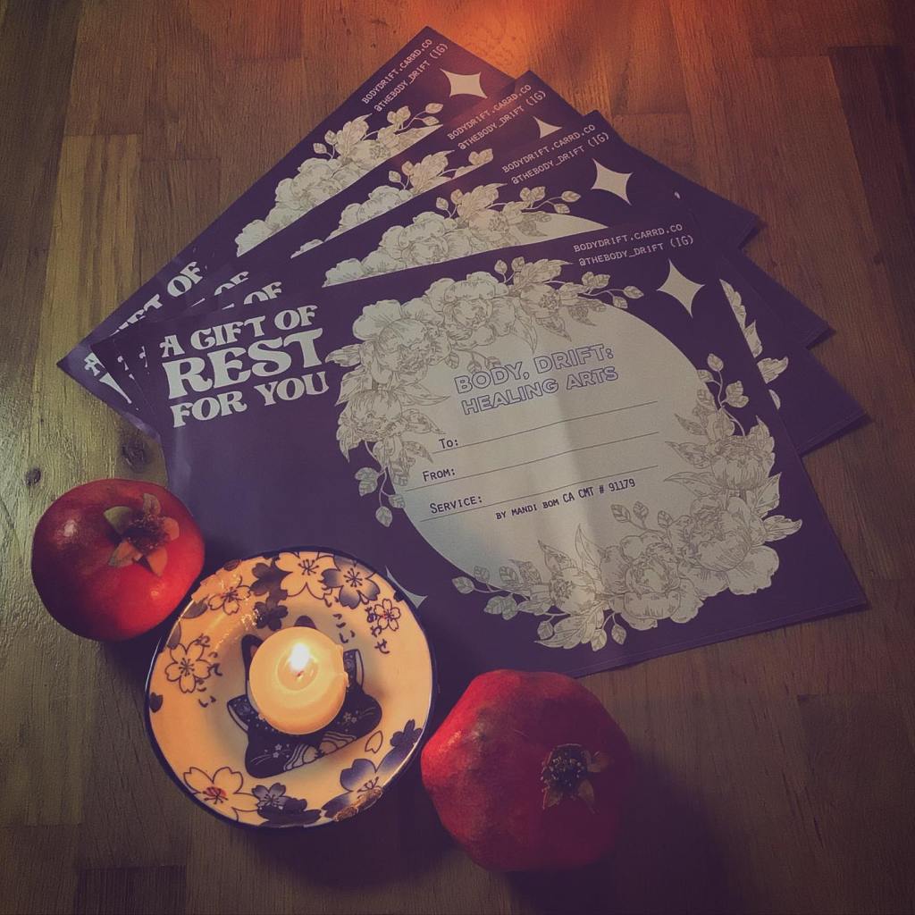 >>>Gift certificates are available at accessible rates now through February 14. For each gift certificate purchased or client referral made now through February, your next session will be extended for 30 minutes (at no additional cost). Gift certificates are available in printed paper or digital formats→ 80 minutes for $80 for in-office sessions and 60 minutes for $90 or 90 min for $110 for mobile sessions. Purchase 3 gift certificates and get one free! You may either choose to set up the day and time for your loved one or allow them to do so. Simply send an email to thebodydrift@gmail.com to arrange.